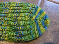 This design was inspired by Tom Bombadil from the Fellowship of the Ring by J.R.R Tolkien. He was a great character, but was not included in the movie (probably for the sake of length!). Anyway, according to Tom’s song: “Old Tom Bombadil is a merry fellow; Bright blue his jacket is, and his boots are yellow.” Tom’s wife, Goldberry, the River’s Daughter first appears in the book dressed in green. Hence the colorway of this yarn! I love the way the colors wind around the sock like Tom’s paths; and if you look closely at small sections of the ribbing on this sock, you may see Tom’s hopping footprints as he leads the hobbits to safety.